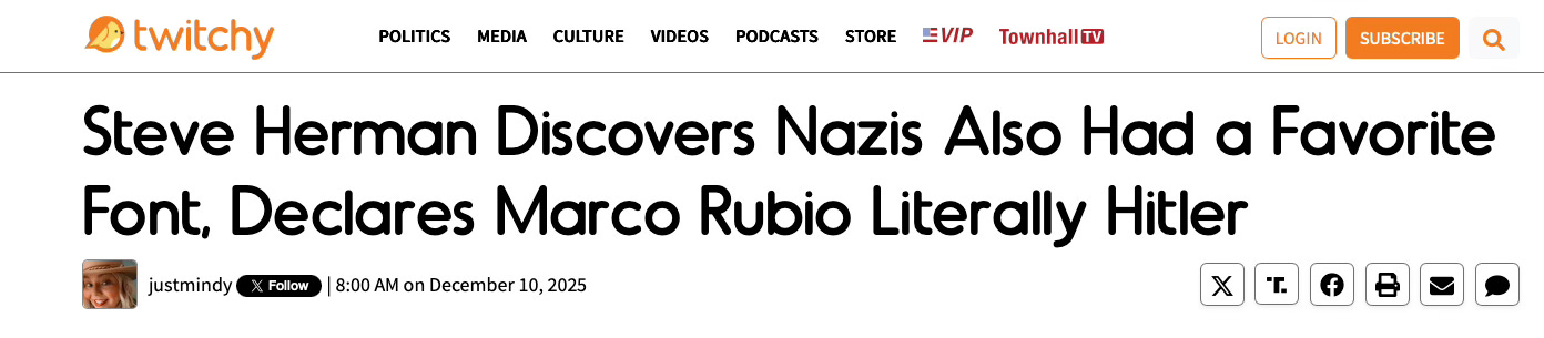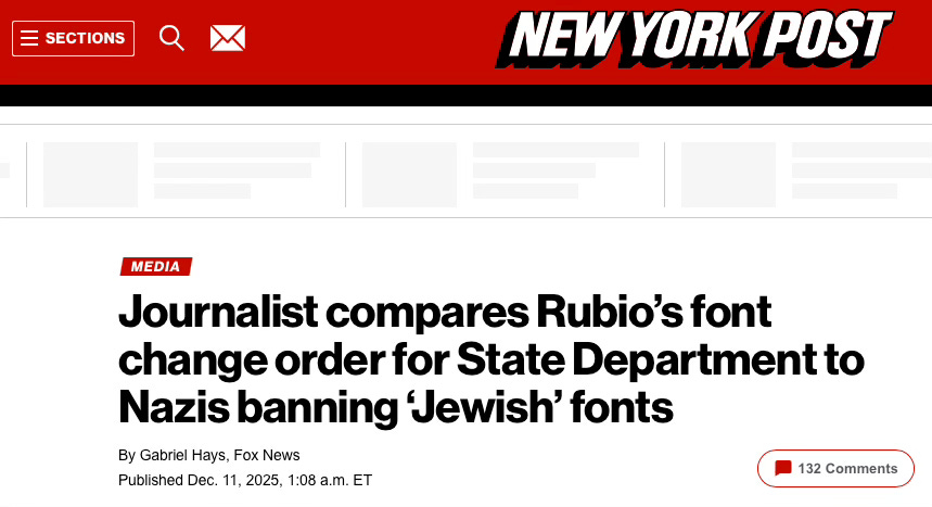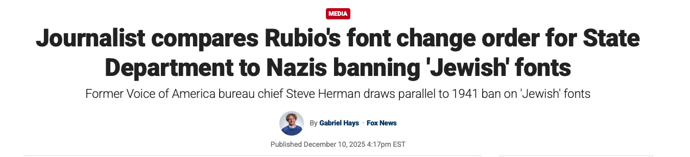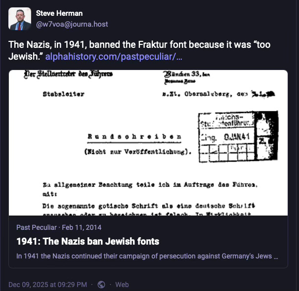 I would note that no outlet contacted me for comment, they just lifted from each other. If I was making any statement at all it was that the US government in 2025 was banning a font for being ‘woke’ and Germany in 1941 banned a font for being ‘Jewish.’ You can make your own assessment of historic relevance.